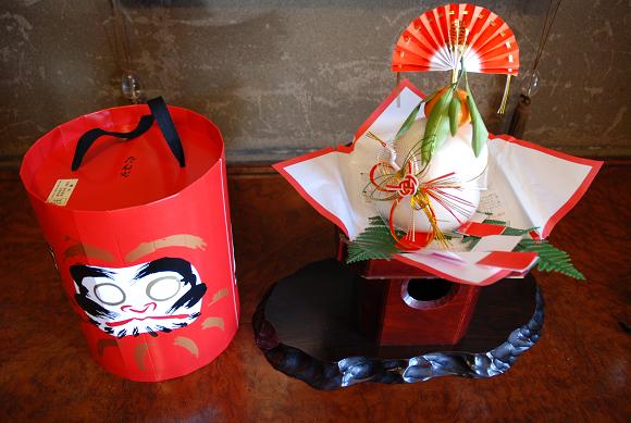 今年は変なお菓子の「福箱」というのを、買いました。赤い円柱の中から、こんな紅白の球が出てきて、その中にゴチャゴチャと入っていました。We bought a sweets box. When we opened it this big red and white ball came out. It is full of traditional sweets.