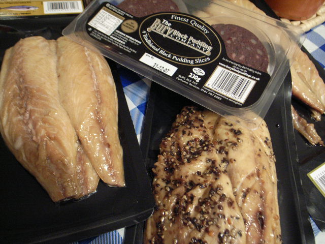 This is the feature of today... Smoked mackerel! We cannot get it here. And black pudding...