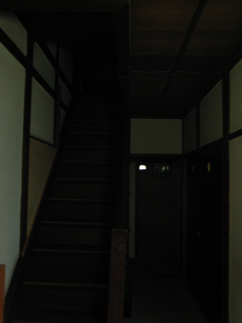 最後に、古い家は怖い家でもあるという写真。廊下を曲がって、家の奥へ入って行くと・・・真っ暗な奥に階段があります。一人で二階に昇れます?