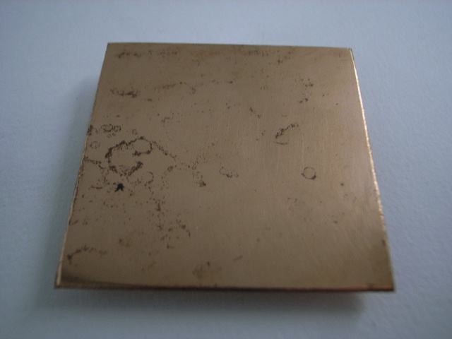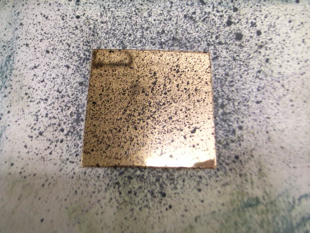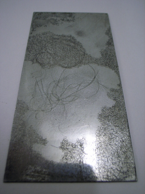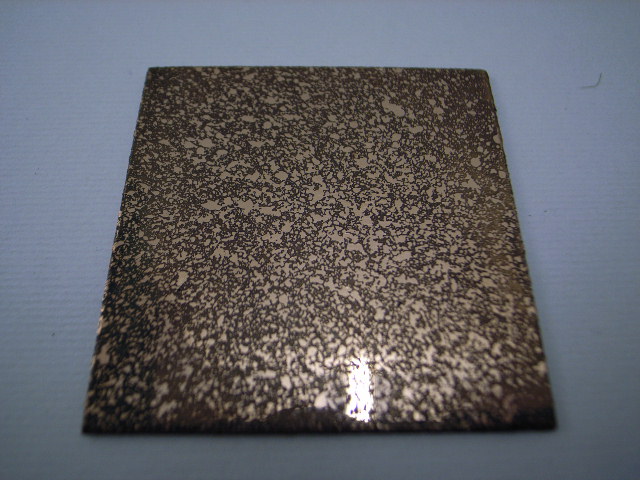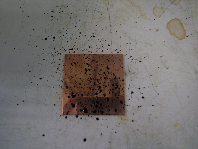 ブラック・ストローハット・バーニッシュ(=黒い麦わら帽子バーニッシュ!!?)という液体があります。普段は、プレートの裏をカバーするのに使う、ストップアウト・バーニッシュよりずっとサラサラした液体です。これを筆で一面に振りかけてみました。