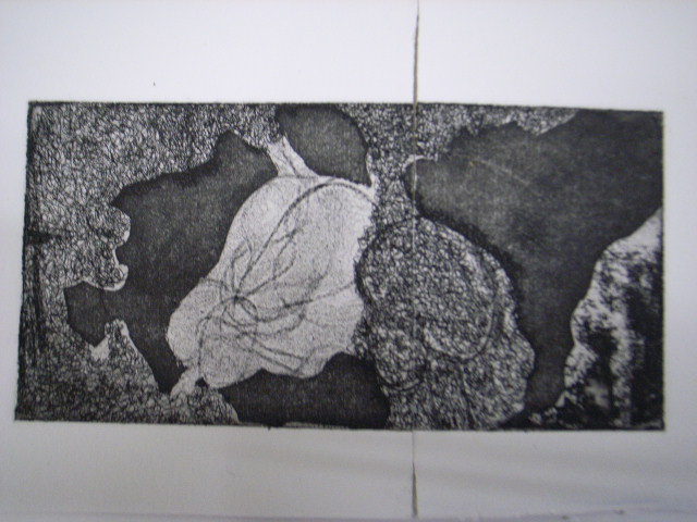 I put aquatint on the yesterday's plate. Then prited it out. I liked it. Looks like the skin of a Koi carp I thought... This is the end for this jumbled etching!