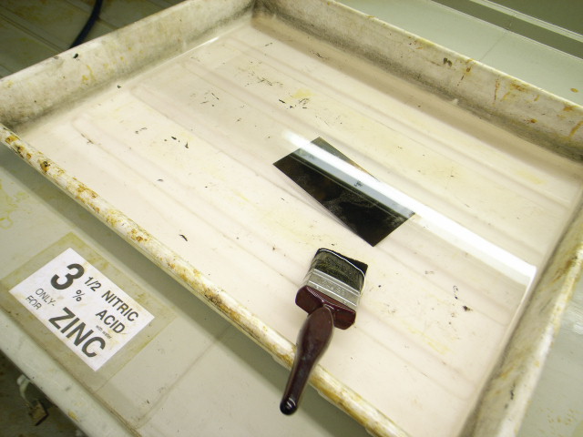 昨日のプレートを酸に浸けます。酸に入ると、ハードグラウンドにカバーされていない、むき出しの亜鉛が酸に溶け、そこから小さな泡がプチプチと出てきます。これを放っておくと、泡の空気が酸に溶けるのを妨げるので、時々刷毛でその泡をどかします。